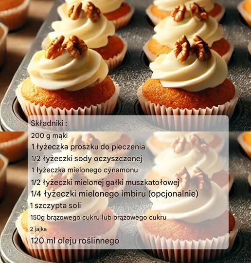 Rozgrzej piekarnik do 180°C (gaz 6) i przygotuj foremkę na muffiny z papierowymi foremkami do pieczenia. Ubij mokre składniki: W dużej misce ubij jajka z brązowym cukrem, aż będą piankowate. Dodaj olej i dobrze wymieszaj. Wymieszaj suche składniki z mokrą mieszanką w trzech partiach, aż uzyskasz gładkie ciasto. Następnie dodaj startą marchewkę, orzechy włoskie i rodzynki. Podziel ciasto na foremki na muffiny, wypełniając je do 3/4 wysokości. Piecz przez 18 do 20 minut lub do momentu, aż wykałaczka włożona do środka będzie czysta. Pozostaw do całkowitego ostygnięcia przed dodaniem lukru. Udekoruj babeczki lukrem za pomocą rękawa cukierniczego lub szpatułki. Aby nadać potrawie ostateczny szlif, posyp ją kawałkami orzechów włoskich lub szczyptą cynamonu.