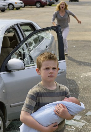 Ale w połowie drogi coś kazało mu się zatrzymać. W granatowym hatchbacku, zaparkowanym w słońcu, siedziało małe dziecko, przypięte w foteliku samochodowym. Policzki dziecka były fioletowe, usta otwierały się i zamykały w rozpaczliwym krzyku, który ledwo przedostawał się przez szczelnie zamkniętą szybę. Po skroniach spływały mu krople potu.