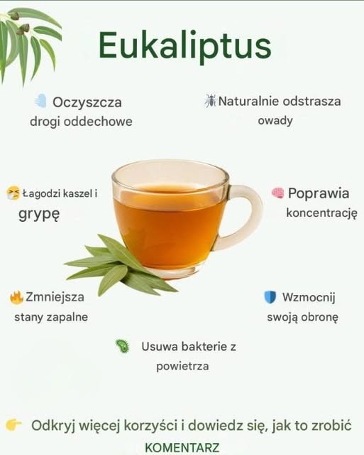 Eukaliptus gałkowy ( Eucalyptus globulus ) to roślina lecznicza znana ze swoich właściwości antyseptycznych, wykrztuśnych i przeciwzapalnych. Jej liście zawierają związki takie jak cyneol (eukaliptol), które pomagają udrożnić drogi oddechowe, złagodzić zapalenie stawów i wzmocnić układ odpornościowy. Poniżej przedstawiam kilka domowych i naturalnych przepisów, aby skorzystać z jego zalet.