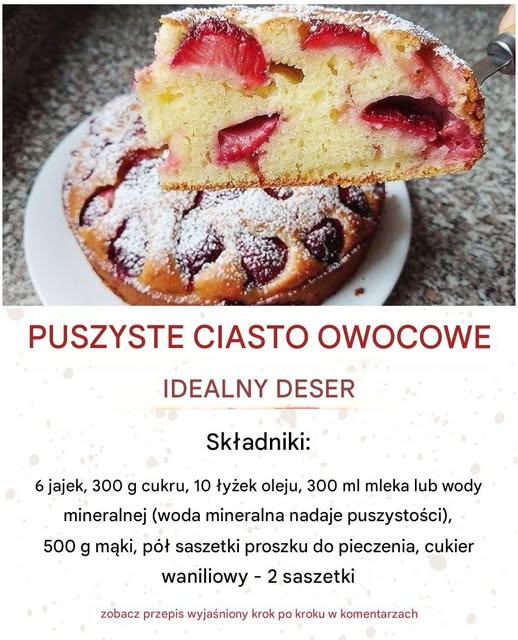 Puszyste ciasto owocowe – idealny deser. Możesz użyć dowolnych owoców, które lubisz najbardziej.